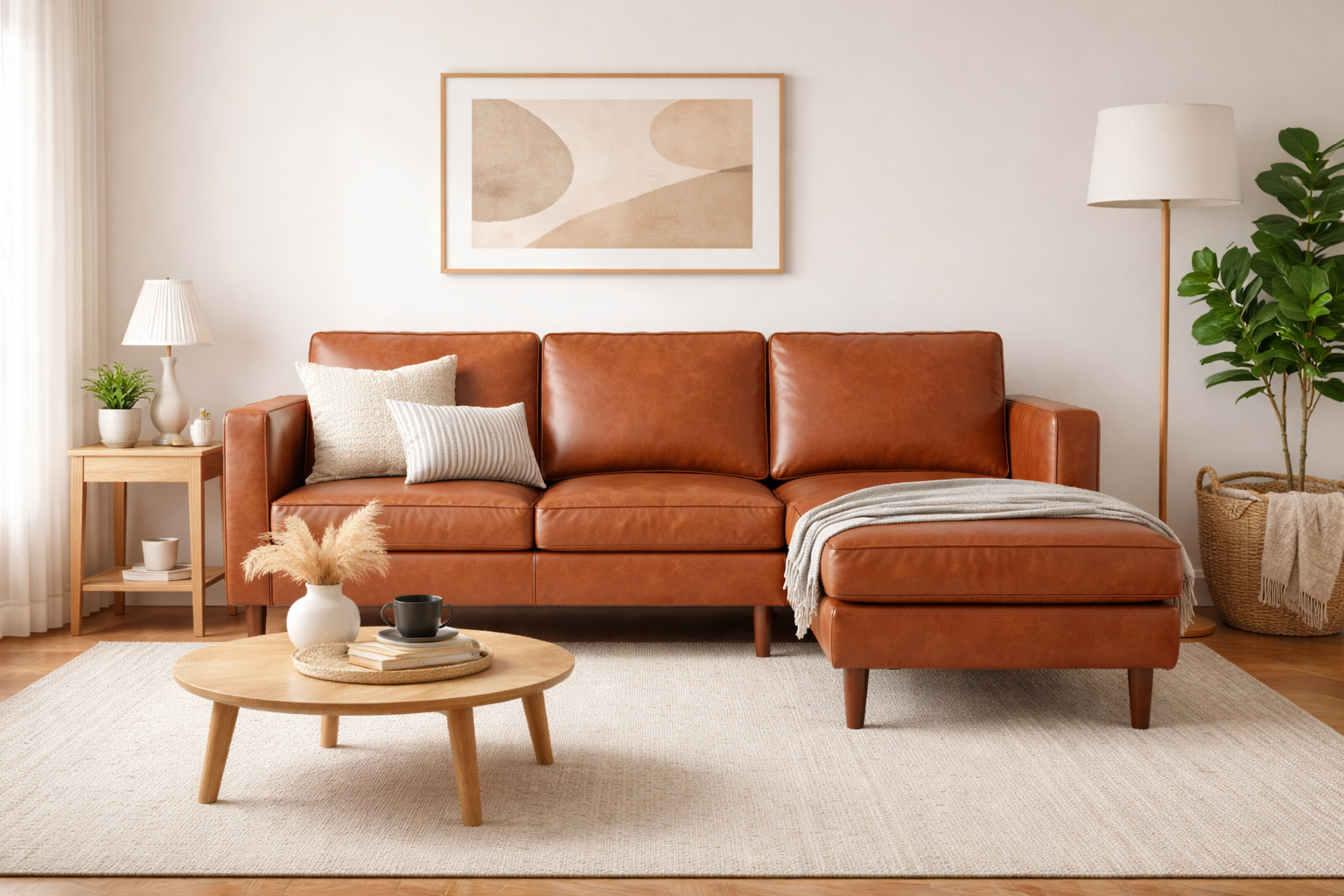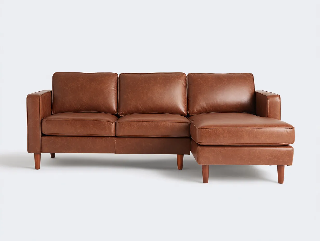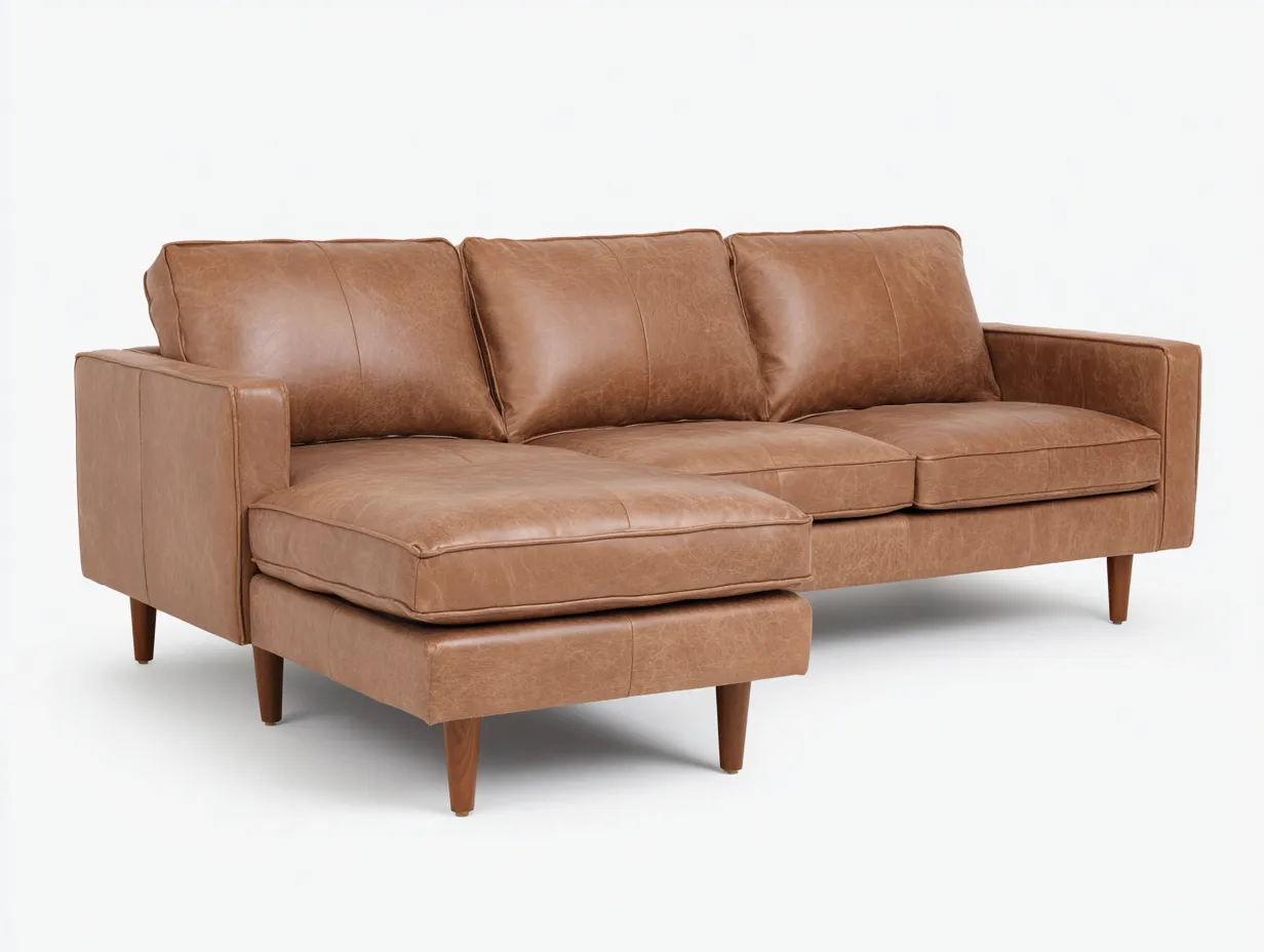 Sofá rinconero de cuero marrón camel con chaise longue 246 x 154 x 85 cm - para salón - estilo moderno y acogedor