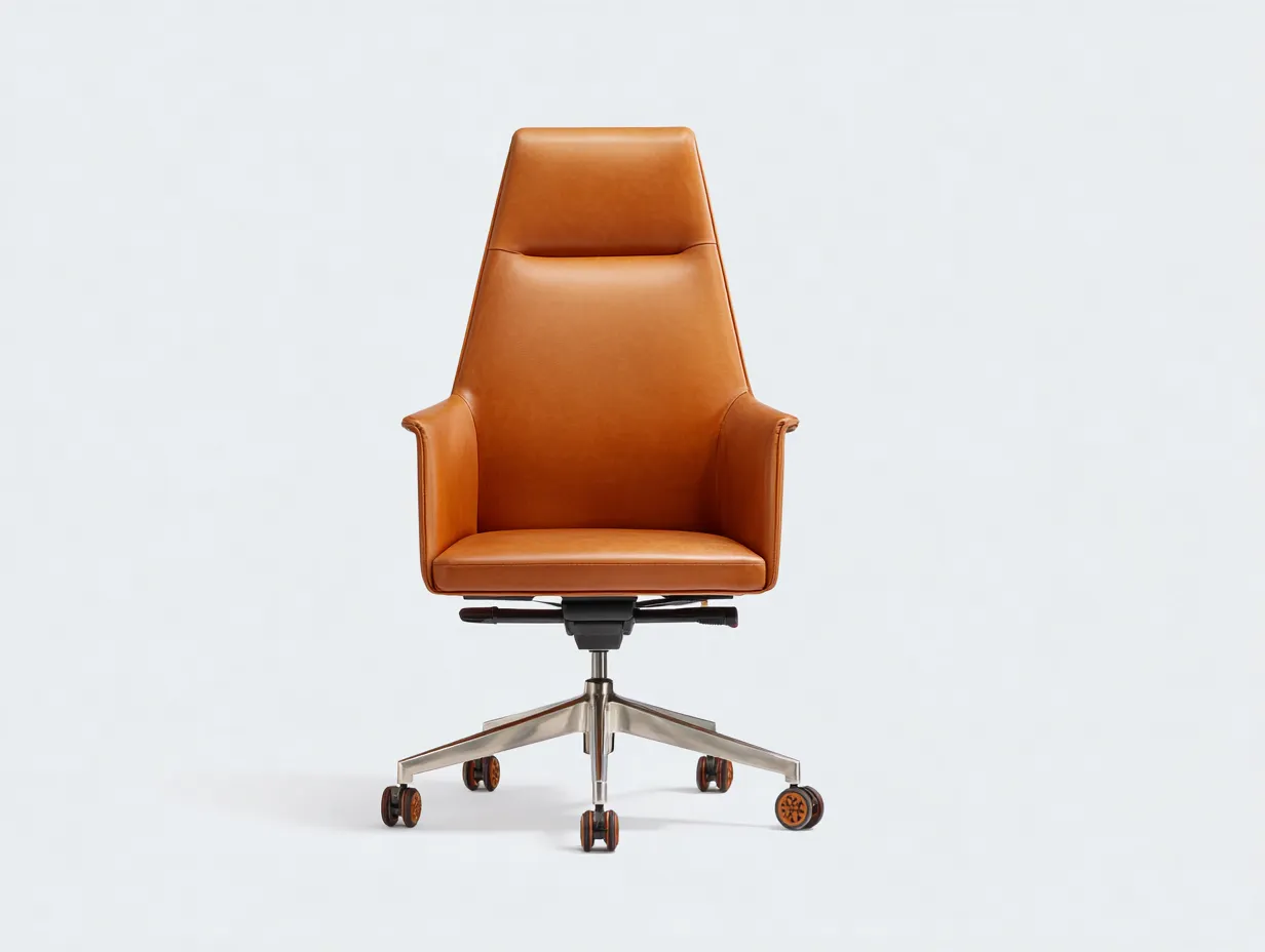 La silla está tapizada en cuero camel con una superficie de aspecto suave y uniforme, pensada para ofrecer una presencia refinada y un uso diario agradable. El respaldo alto incorpora una línea superior diferenciada que mejora la composición visual del conjunto. La base metálica pulida con cinco radios aporta estabilidad, mientras que las ruedas integradas permiten un desplazamiento fluido alrededor del escritorio.