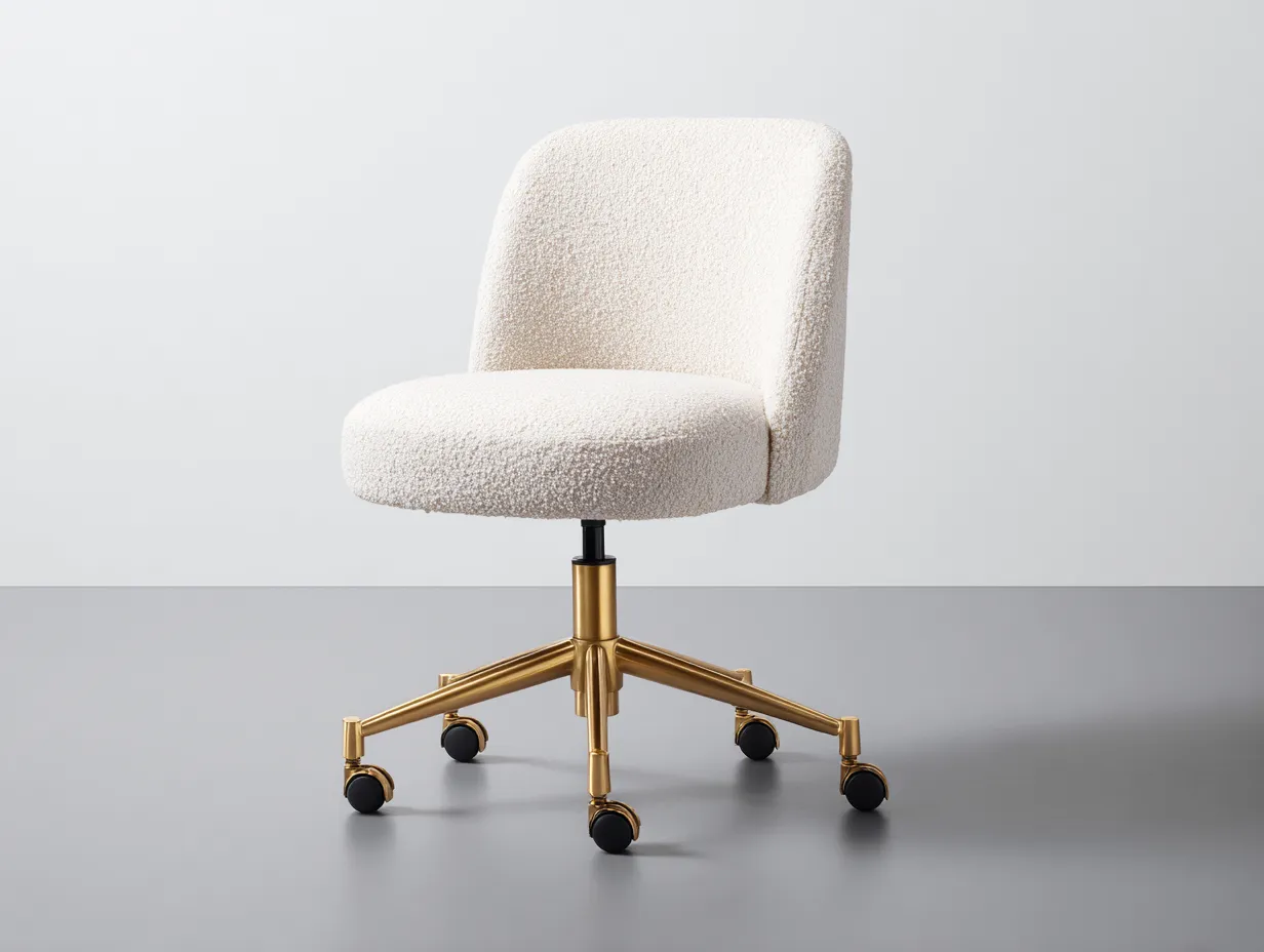 La silla está revestida en tejido bouclé blanco con textura visible, lo que añade profundidad visual y un acabado más decorativo al conjunto. El asiento acolchado y el respaldo continuo están diseñados para ofrecer una sensación confortable en el uso diario. La base metálica dorada de cinco radios crea un contraste elegante con el tapizado claro y garantiza estabilidad, mientras que las ruedas integradas facilitan el desplazamiento.
