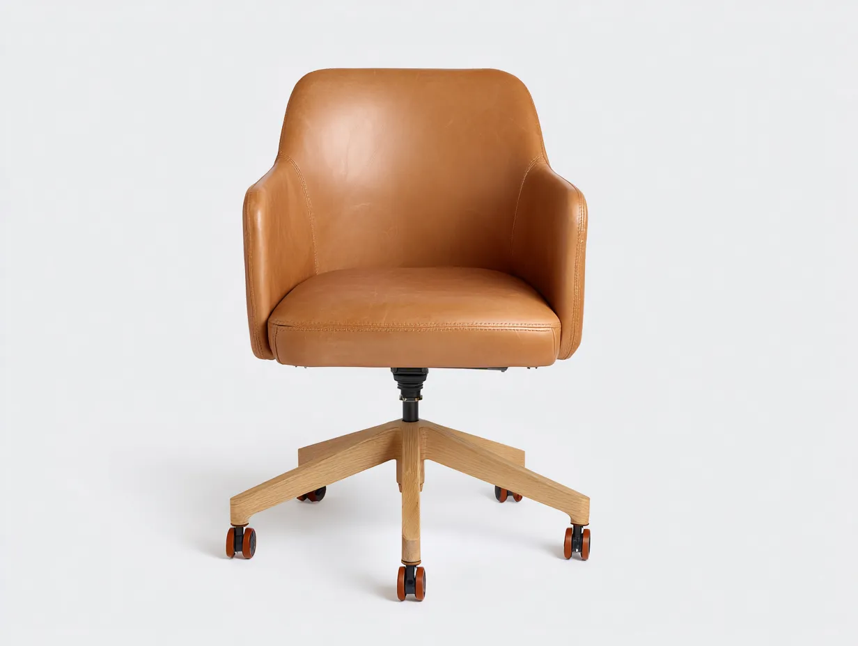 La silla está revestida en cuero camel con un aspecto suave y natural, con costuras discretas que realzan la calidad visual del conjunto. La base de cinco radios en madera clara aporta un toque más cálido y crea un contraste armonioso con la estructura central. Las ruedas integradas facilitan el desplazamiento y refuerzan la practicidad de uso diario.