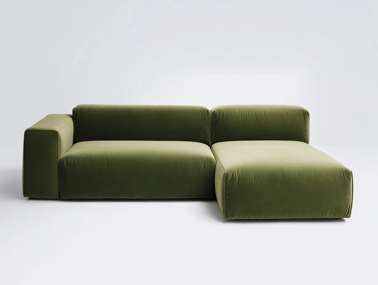 Este sofá rinconero de terciopelo verde oliva con chaise longue aporta al salón una estética serena, contemporánea y muy depurada. Su diseño de volúmenes amplios, líneas bajas y superficies continuas crea una sensación visual de calma y amplitud, ideal para interiores modernos que buscan confort sin exceso decorativo. El tono verde oliva añade profundidad y un matiz natural que combina con madera, negro mate o textiles neutros, mientras que el terciopelo suaviza el conjunto con una textura envolvente y elegante. La chaise longue amplía la superficie de descanso y permite una postura más libre en el uso diario. Gracias a su composición modular y a su presencia equilibrada, este modelo funciona como pieza central en el salón, ofreciendo una imagen sobria, acogedora y actual.