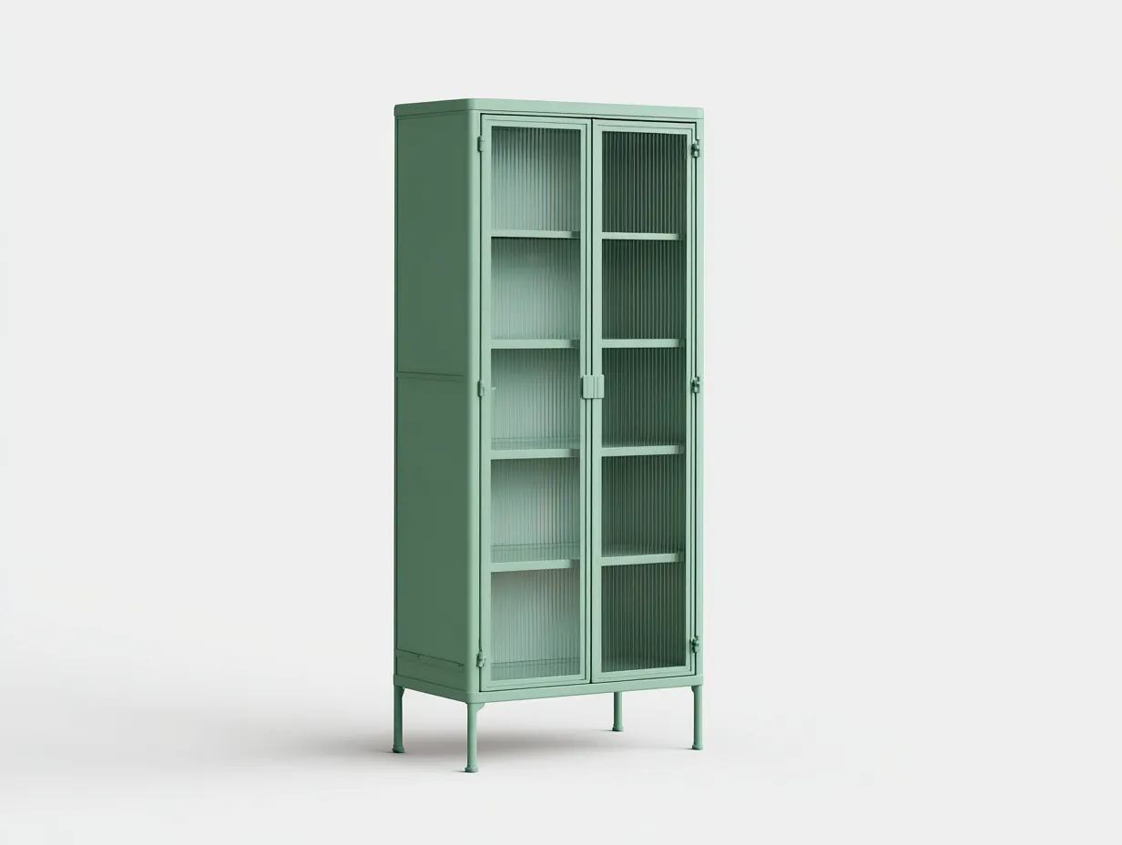 Realizada en metal, esta vitrina presenta una estructura estable y adecuada para un uso diario en el salón. Las puertas de cristal permiten una lectura visual más ligera al tiempo que protegen el contenido del polvo. El conjunto ofrece un buen equilibrio entre solidez, funcionalidad y delicadeza estética.