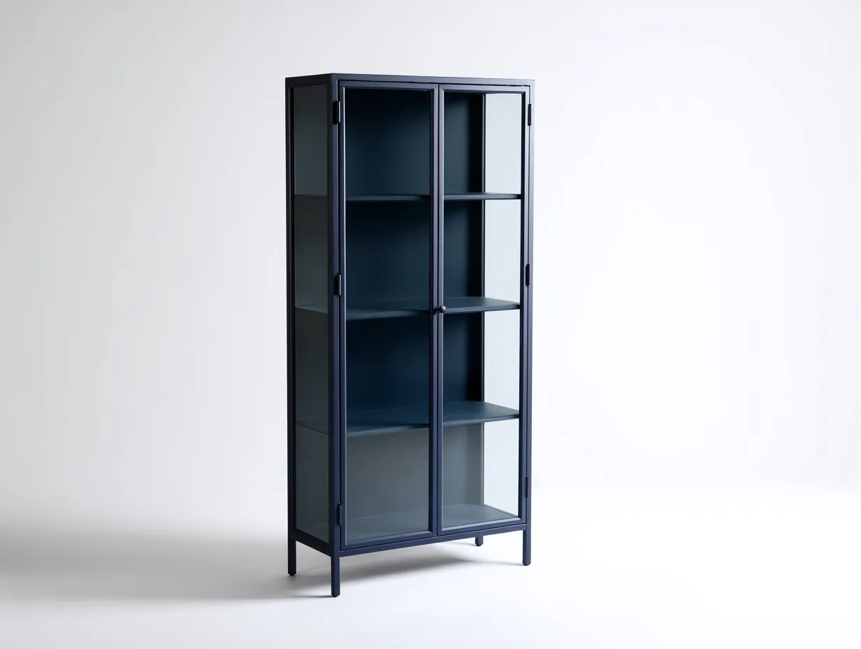 El mueble combina una estructura de metal en azul oscuro con paneles de vidrio en la parte frontal y lateral, pensados para un uso interior habitual. Los estantes interiores permiten distribuir mejor el contenido y favorecen una presentación limpia y equilibrada. La base elevada y las líneas rectas del marco refuerzan una silueta ligera, moderna y fácil de combinar con diferentes estilos decorativos.